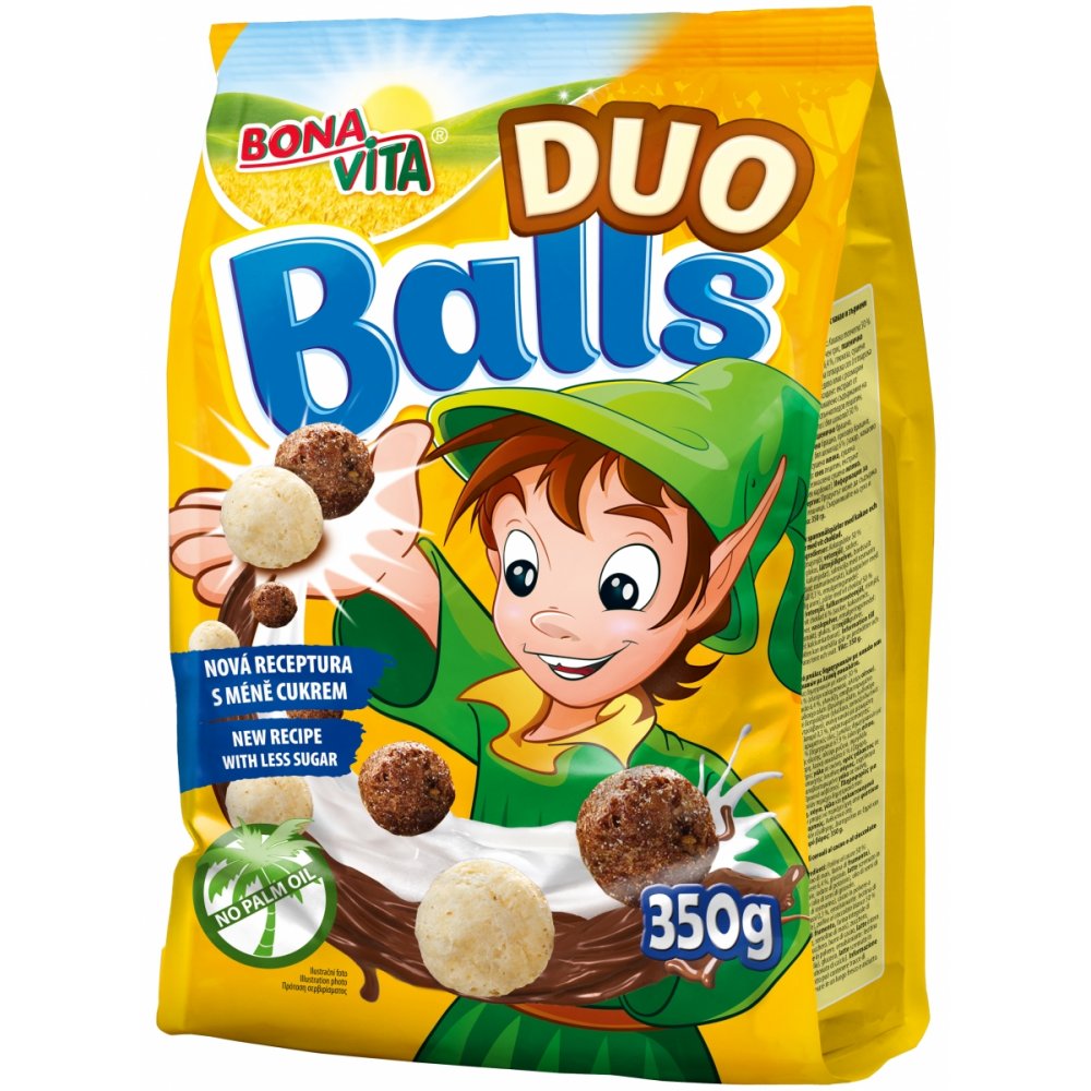 Cocoa balls 50 % [cereals 69.6% (corn semolina, wheat flour), sugar, cocoa powder 6.4%, glucose, skimmed milk powder, iodized salt (edible salt, potassium iodate), sunflower oil with rosemary (sunflower oil, antioxidant: extract of rosemary), fat reduced cocoa powder 0.3%, emulsifier: sunflower lecithin, natural flavour.], balls with white chocolate 50 % [cereals 67.9 % (wheat flour, wholegrain wheat flour, rice flour, corn grits), sugar, white chocolate 6 % (sugar, cocoa butter, whole milk powder, whey powder, emulsifier: soy lecithin, vanilla extract), glucose, skimmed milk powder, stabilizer: calcium carbonate]